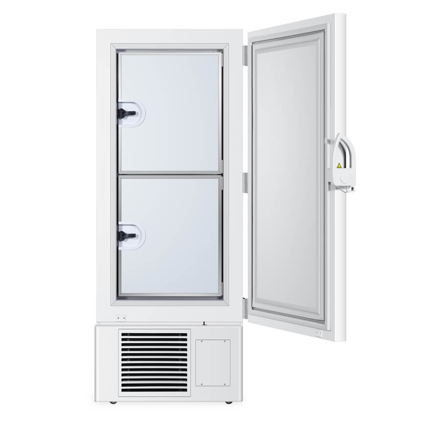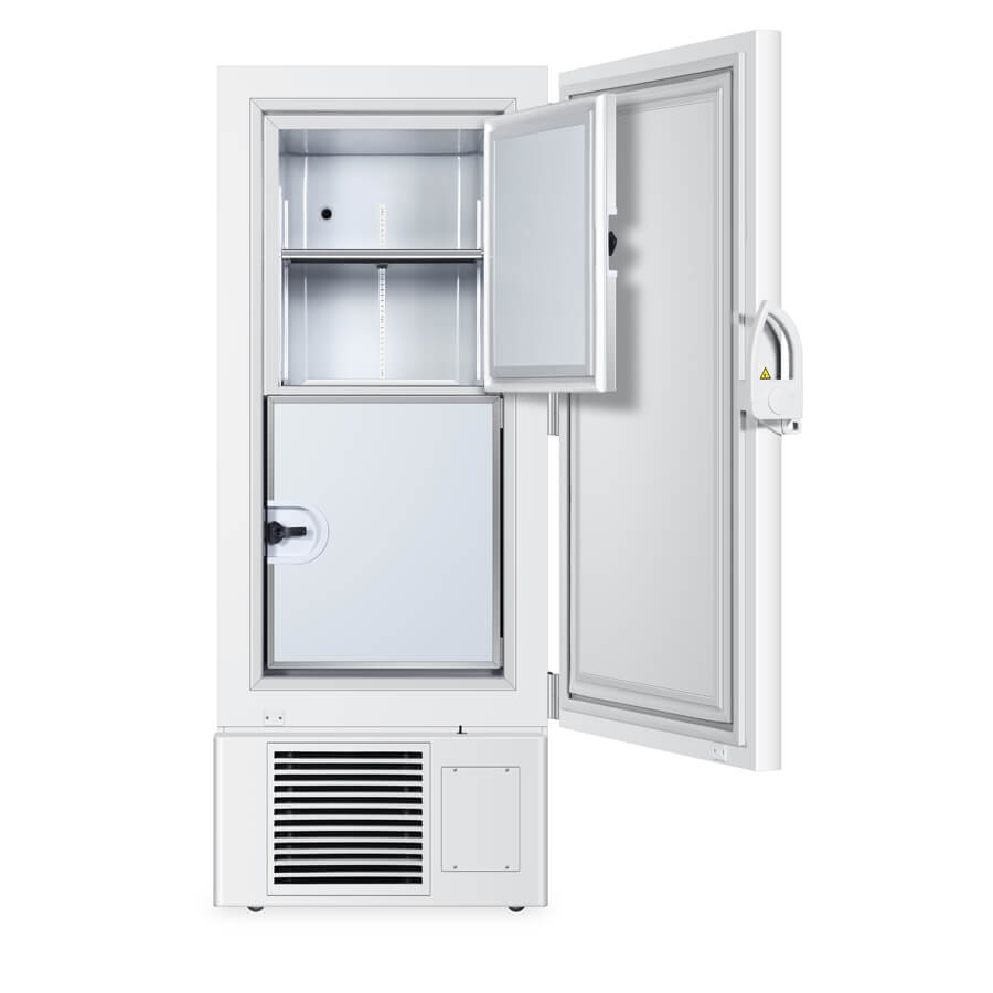 Revolutionize Cold Storage: This -86°C ultralow temperature freezer boasts state-of-the-art insulation technology. Its main body integrates polyurethane and VIP insulation, providing a formidable barrier to preserve low temperatures. The outer door features a quadruple gasket to prevent cold air loss, complementing a sturdy latch for a secure seal. Inside, the segmented inner doors, each insulated and single-gasket, offer an additional layer of temperature control. Stainless steel shelves, aligned with these segmented doors, allow quick access to specific samples while maintaining the integrity of other compartments.