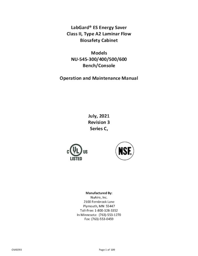 Operation and maintenance manual for LabGard NU-545 Series C Class II, Type A2 Biosafety Cabinet.