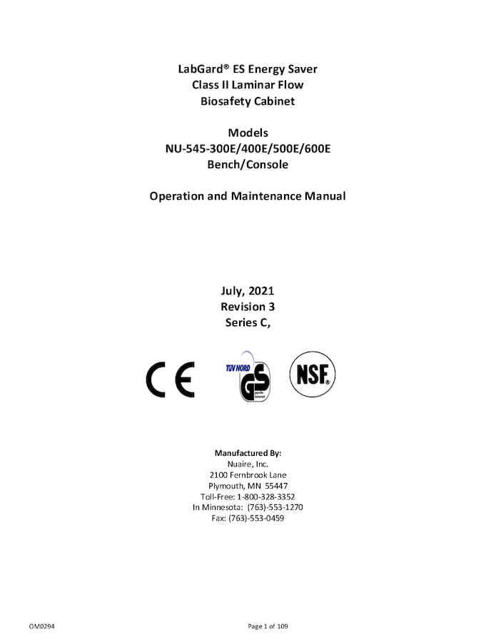 Operation and maintenance manual for LabGard NU-545E Series C Class II, Type A2 Biosafety Cabinet.