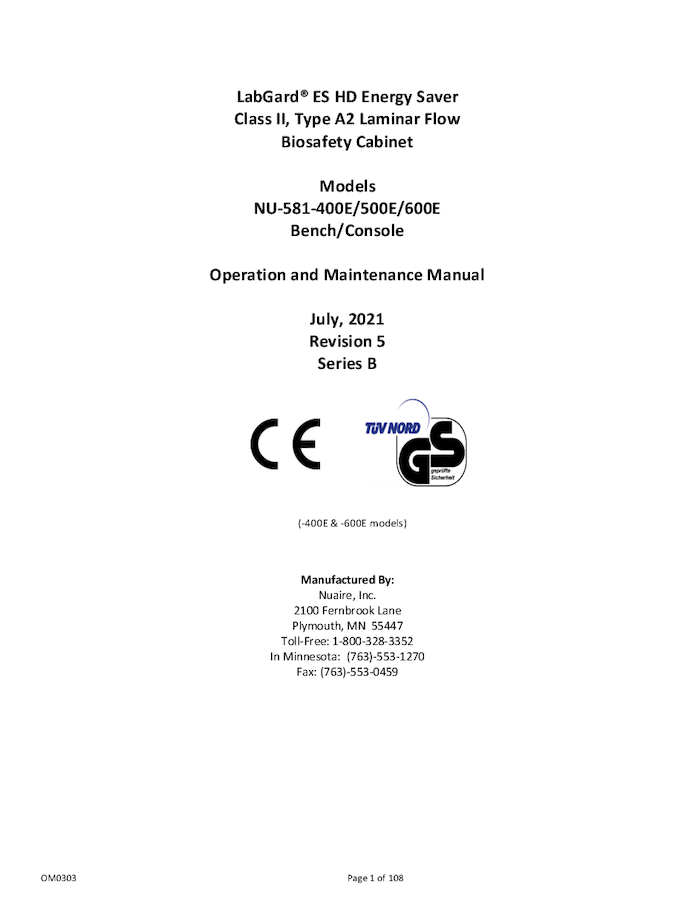 Operation and maintenance manual for LabGard NU-581E Series B Class II, Type A2 Biosafety Cabinet.