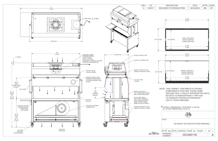 Discover an indispensable resource for your vivarium with our technical product drawing for the NU-620-500 and NU-621-500 Animal Transfer Stations (ATS). Engineered with a nominal width of 5 feet (1.5 meters) and operating on a 115-volt system, this comprehensive document outlines critical dimensions, standard features, and customizable options to maximize cage changing workflow in the vivarium. The drawing showcases the state-of-the-art design that aids in small animal cage changing while providing safeguards to maintain animal sterility. Whether you’re involved in purchasing or actively working on vivarium design, this detailed document enables precise space planning and electrical provisioning to ensure seamless integration into your existing setup. With keen attention to ergonomics and functionality, our ATS units are crafted to promote efficiency and sterility, making this technical drawing a must-have tool for your next project.