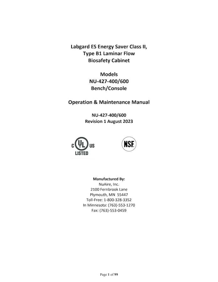 Operation and Maintenance Manual for LabGard NU-427-400 and NU-427-600 Class II, Type B1 Biosafety Cabinets