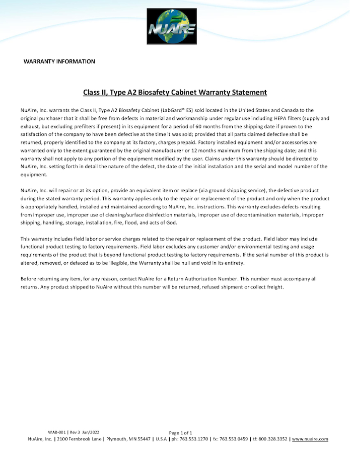 NuAire Class II, Type A2 Biosafety Cabinets (BSC) are covered by a robust standard 6-year parts warranty that includes HEPA filters.