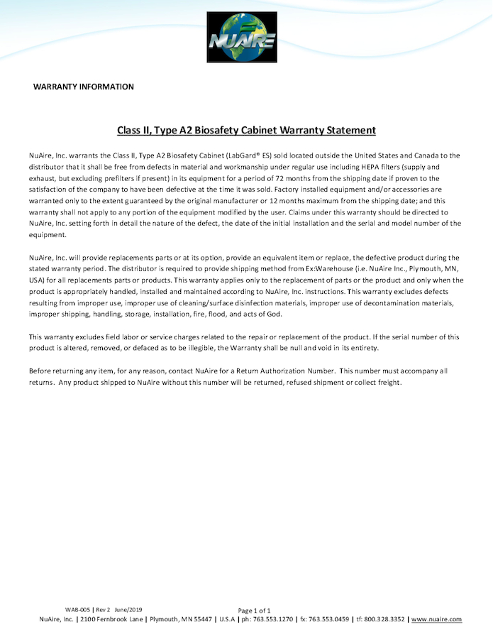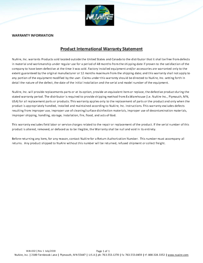 NuAire offers a standard 4-year comprehensive parts warranty on laboratory products sold internationally.