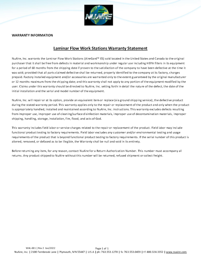 NuAire provides a standard 5-years parts & labor warranty on laminar airflow workstations (LAFW) sold in the United States or Canada.