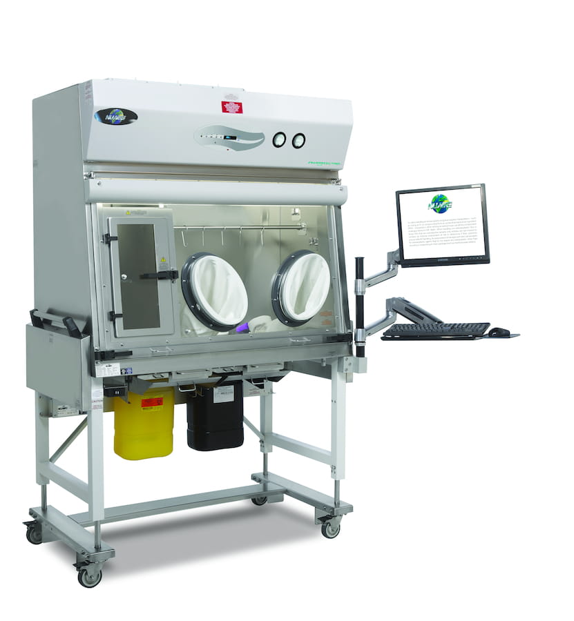 The LabGard NU-543 pharmacy configuration features a smooth interior work zone for cleanability, exhaust airflow transition, an IV bar, and an optional base stand. Model NU-543 can be outfitted with an Ergotron arm or backwall cut out to house a monitor and keyboard for managing medication workflow systems.