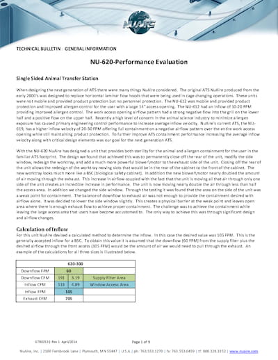 When designing the next generation of Animal Transfer Stations (ATS), there were many things NuAire considered. The original ATS NuAire produced from the early 2000s was designed to replace horizontal laminar flow hoods that were being used in cage changing operations. These units were not mobile and provided product protection but no personnel protection. The NU‐612 was mobile and provided product protection and improved allergen control for the user with a large 14” access opening. The NU‐612 had an inflow of 10‐20 FPM providing improved allergen control. The work access opening airflow pattern had a robust negative flow into the grill on the lower half and a positive flow on the upper half. Recently a high level of concern in the animal science industry to minimize allergen exposure has caused primary engineering control performance to increase average inflow velocity. NuAire’s current ATS, the NU‐ 619, has a higher inflow velocity of 20‐30 FPM, offering full containment on a negative airflow pattern over the entire work access opening while still maintaining product protection. To further improve ATS containment performance increasing the average inflow velocity and critical design elements was our goal for the next generation ATS.