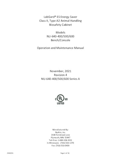 Operation and maintenance manual for LabGard NU-640 Series A Animal Handling Class II, Type A2 Biosafety Cabinet Manaul