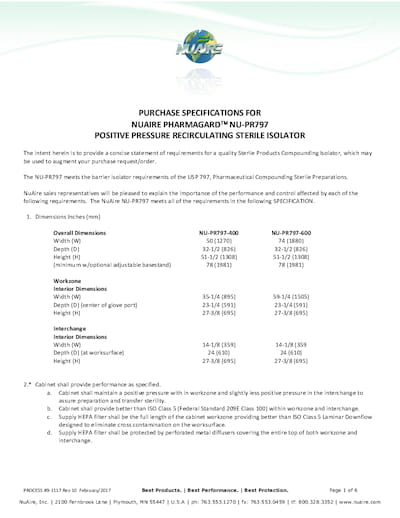 The PharmaGard model NU-PR797 positive pressure recirculating Compounding Aseptic Isolator (CAI) provides a sterile positive pressure work environment for the compounding of non-hazardous drugs. View these product specifications to learn technical details and features of model NU-PR797.