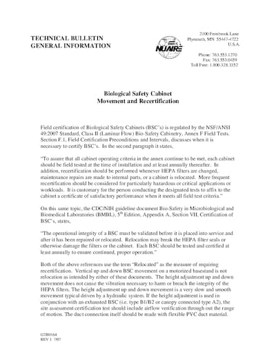 NSF/ANSI 49 and BMBL (Biosafety in Microbiological and Biomedical Laboratories) reference the term “Relocated” as the measure of requiring re-certification. Vertical up and down BSC movement on a motorized base stand is not relocation as intended by either of these documents. The height adjustment up and down movement does not cause the vibration necessary to harm or breach the integrity of the HEPA filters. The height adjustment up and down movement is a very slow and smooth movement typical driven by a hydraulic system. If the height adjustment is used in conjunction with an exhausted BSC (i.e. type B1/B2 or canopy connected type A2), the site assessment certification test should include airflow verification throughout the range of motion. The duct connection itself should be made with flexible PVC duct material.
