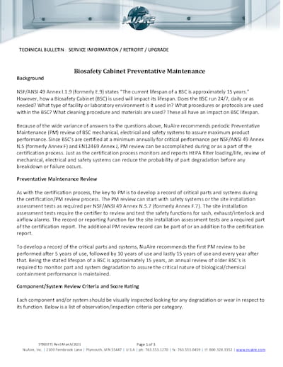 NSF/ANSI 49 Annex I.1.9 (formerly E.9) states, “The current lifespan of a BSC is approximately 15 years.” However, how a Biosafety Cabinet (BSC) is used will impact its lifespan. Does the BSC run 24/7, daily, or as needed? What type of facility or laboratory environment is it used in? What procedures or protocols are used within the BSC? What cleaning procedures and materials are used? These all have an impact on BSC lifespan. Because of the wide variance of answers to the questions above, NuAire recommends periodic Preventative Maintenance (PM) review of BSC mechanical, electrical, and safety systems to assure maximum product performance. Since BSC’s are certified at a minimum annually for critical performance per NSF/ANSI 49 Annex N.5 (formerly Annex F) and EN12469 Annex J, PM review can be accomplished of the certification process. Just as the certification process monitors and reports HEPA filter loading/life, review of mechanical, electrical, and safety systems can reduce the probability of part degradation before any breakdown or failure occurs.