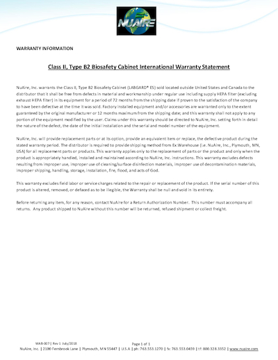 Class II, Type B2 Biosafety Cabinet International Warranty