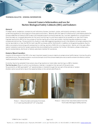 In today’s world, residential, commercial and institutions (homes, businesses, stores, and schools) commonly install camera surveillance systems for the protection of occupants and visitors. Recently with the news of incidents within pharmacies where the Compounded Sterile Products (CSP’s) were not prepared properly (compromised sterility, incorrect ingredients or concentration) there has been an increased awareness for the use of monitoring or surveillance systems to be located on or near the Primary Engineering Controls (PEC’s) for the purpose of monitoring the very critical work and/or maintaining video evidence on past procedures and training. To accomplish this, NuAire is now offering general guidance to aid in the selection of camera systems that can be mounted on or near the PEC for both new PEC purchases and for field retrofit. In addition to the general guidance, NuAire offers one camera choice along with accessories (i.e. cabling, monitors, DVR’s) for a turnkey solution. Nuaire, as in the past, offers special installation options for camera systems that are provided by the customer. For further information, please contact your NuAire representative, distributor or factory sales team member for assistance.