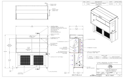 Product specification drawing for 115-volt nominal 6-feet (1.8 meters) horizontal laminar airflow workstation model NU-340-630.