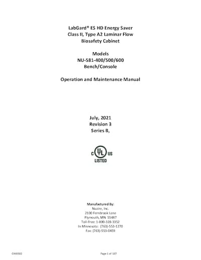 Operation and maintenance manual for LabGard NU-581 Series B Class II, Type A2 Biosafety Cabinet.