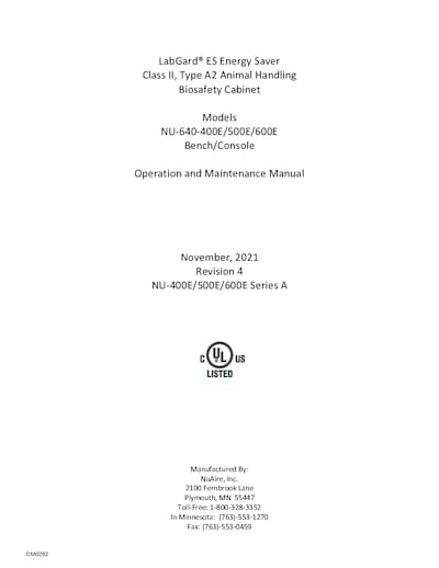 Operation and maintenance manual for LabGard NU-640E Series A Animal Handling Class II, Type A2 Biosafety Cabinet Manaul