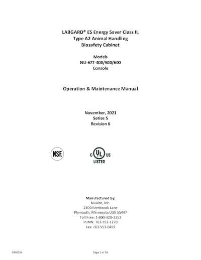 Operation and maintenance manual for LabGard NU-677 Series 5 Animal Handling Class II, Type A2 Biosafety Cabinet.