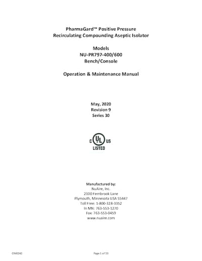 Operation and maintenance manual for PharmaGard NU-PR797 Series 30 Compoudning Aseptic Isolator.